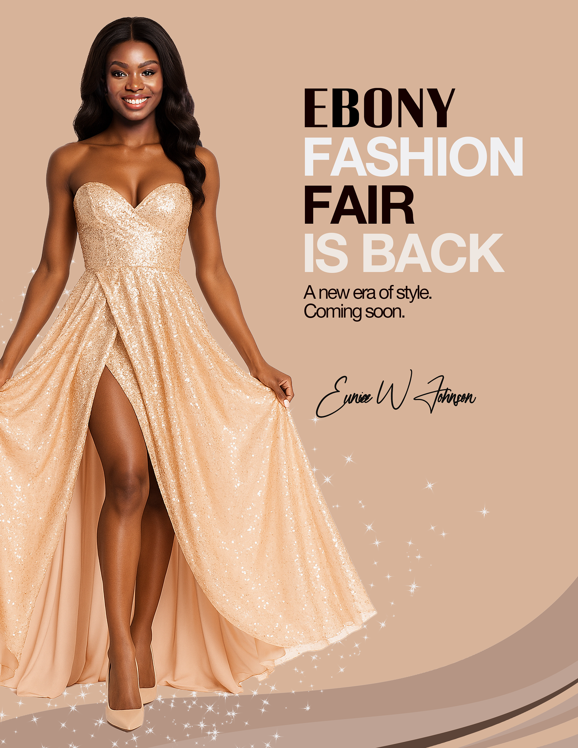 Disclaimer: This project is a conceptual tribute created for portfolio purposes only. Ebony Fashion Fair, Eunice W. Johnson, and any related names or trademarks belong to their respective owners. I do not claim any affiliation or ownership. The models and visuals are AI-rendered to showcase design and layout skills.